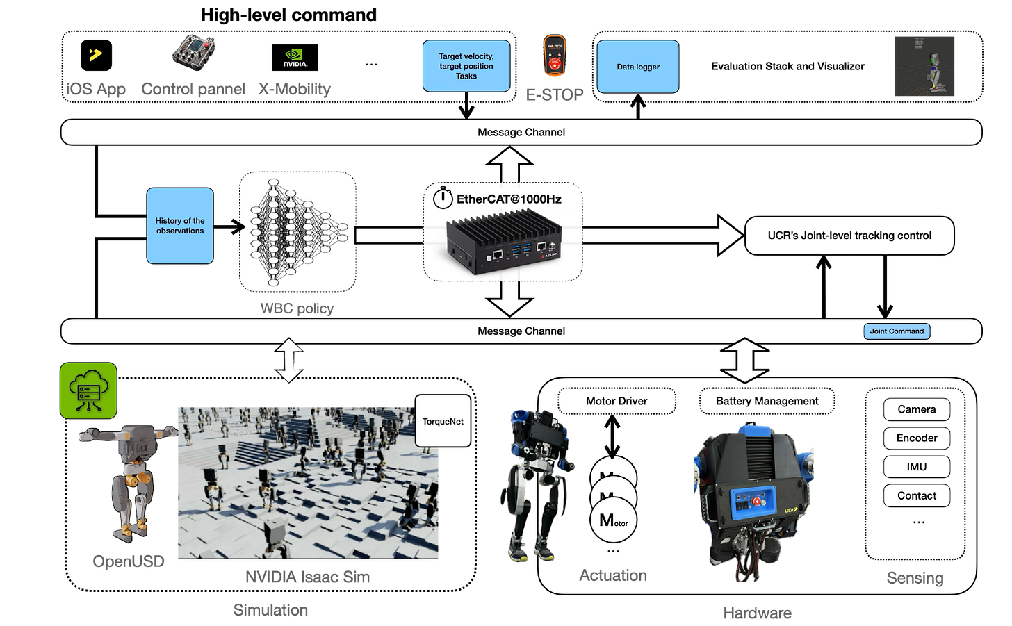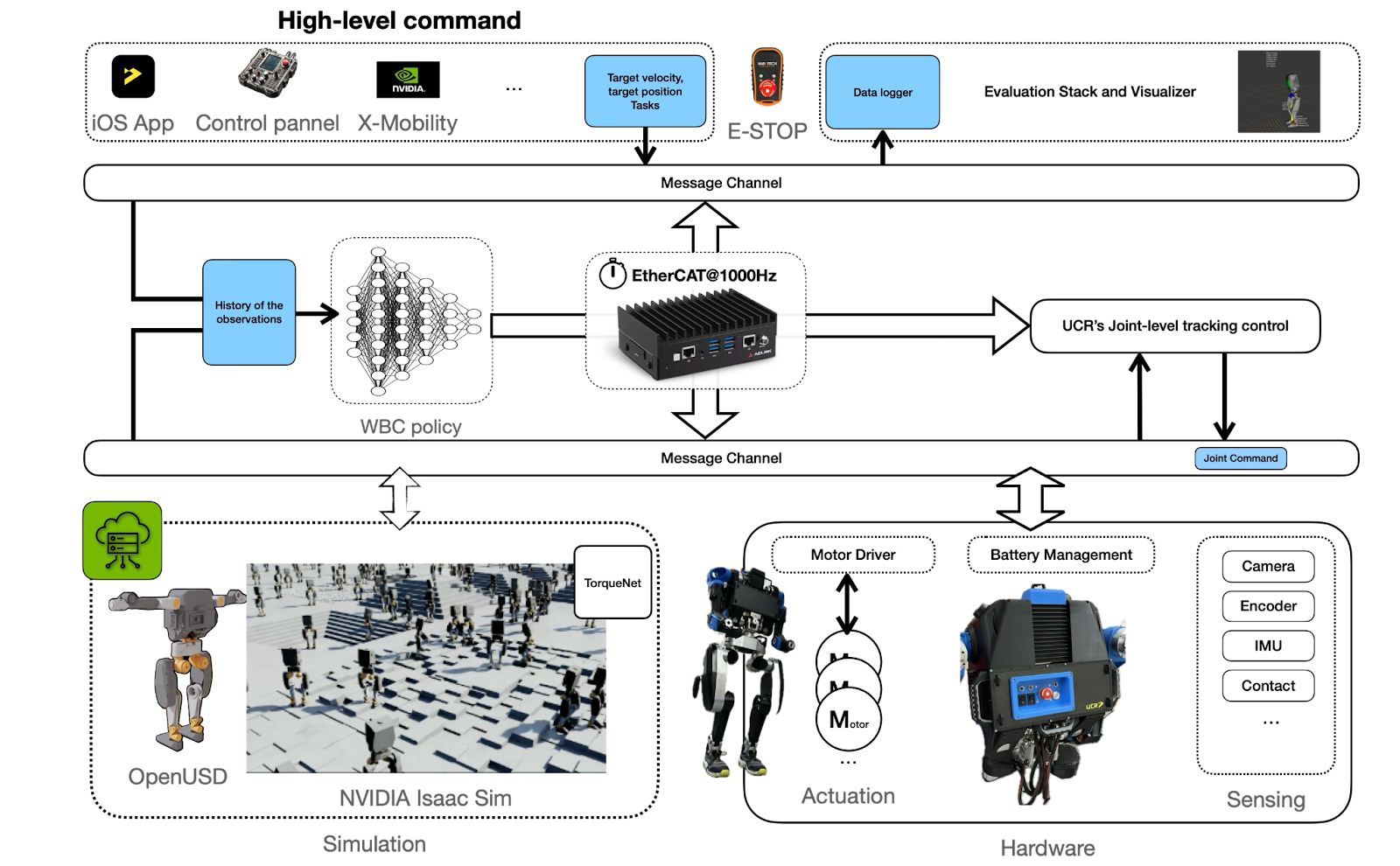 UCR’s entire onboard AI stack is executed on a single NVIDIA Jetson Orin edge AI computer. This includes UCR’s in-house built actuator and sensor drivers that handle real-time communication, system software that controls the behavior of the robot under different operating modes like booting up, safety halts and resetting, and the perception and model inference pipeline, which enables the robot to see, understand, and act. The extraordinary compatibility of NVIDIA CUDA enables the deployment of UCR’s software to the edge after development and evaluation using more powerful NVIDIA workstation GPUs, enabling an unprecedented development speed.