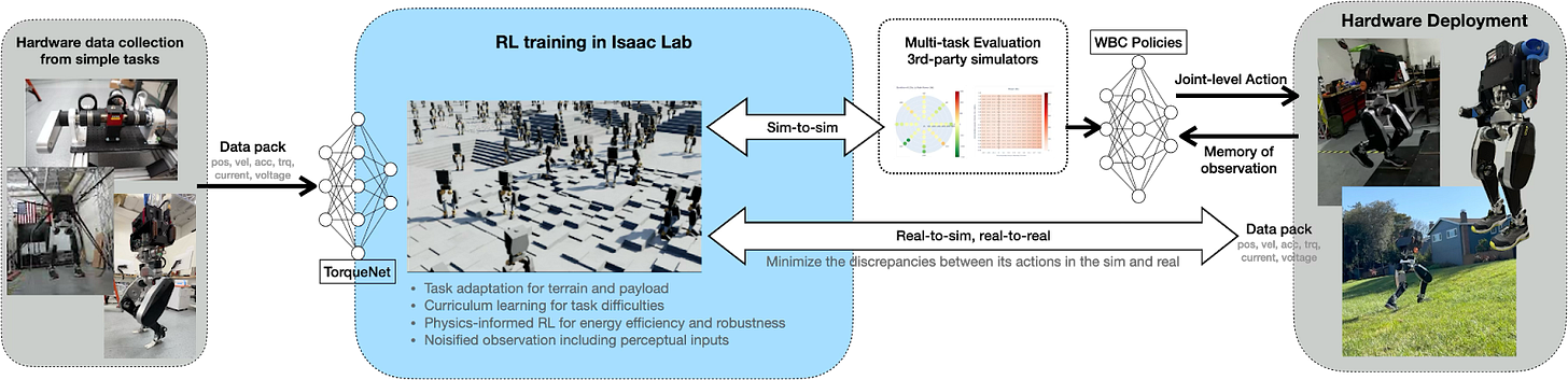 Real2sim. In simulations, the physics model complexity is balanced with computational efficiency and the resulting time it takes to execute a simulation step. Typically, actuator dynamics are oversimplified in simulation settings, which results in important discrepancies impacting the sim-to-real transfer. UCR trained a network to seamlessly embed real-world actuator dynamics into the high-fidelity NVIDIA Isaac Sim environment [2]. The network is trained using data collected from actuators mounted on dynamometers, robots performing fixtured stretching (without contact), and plyometric routines to learn performance characteristics.